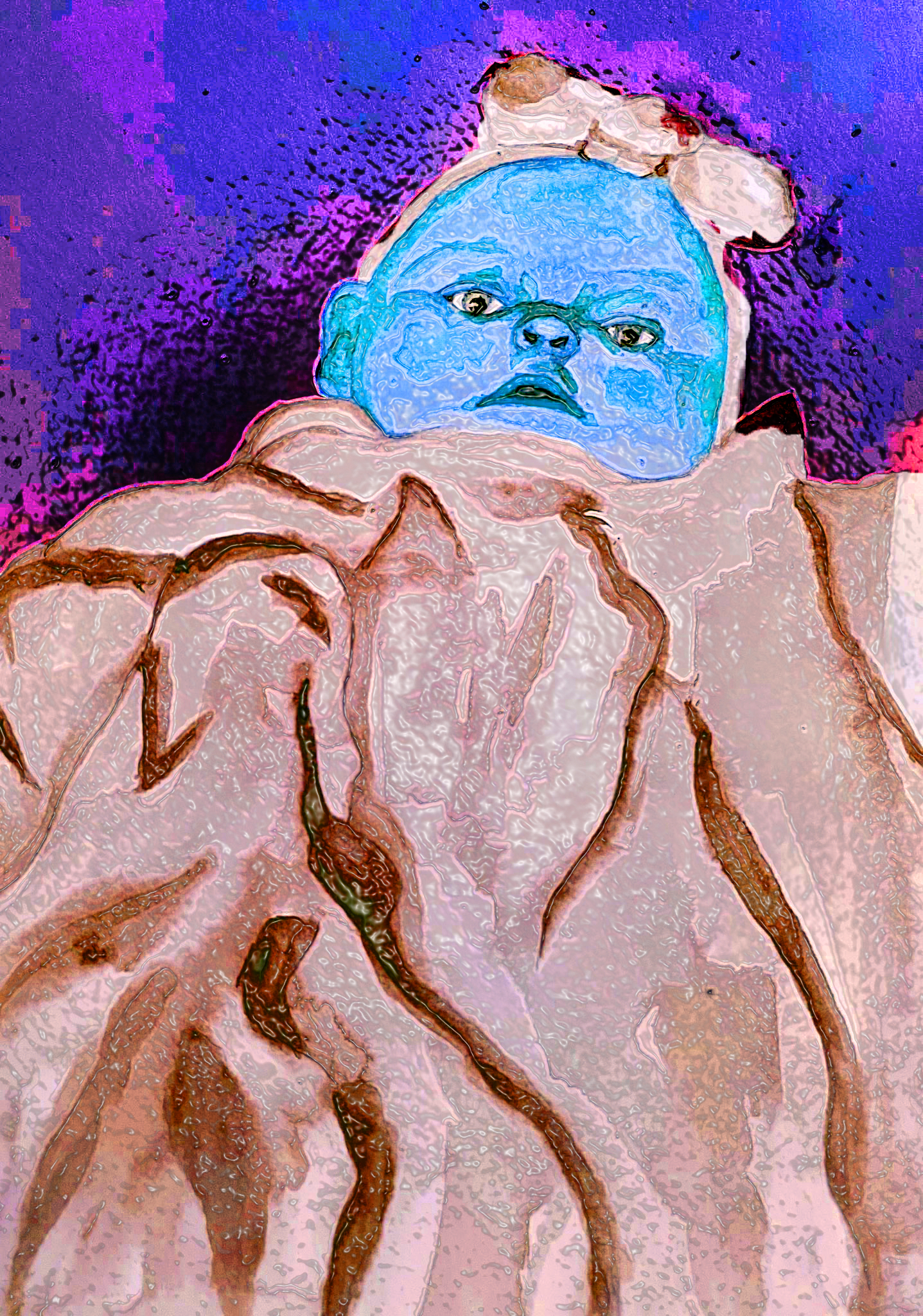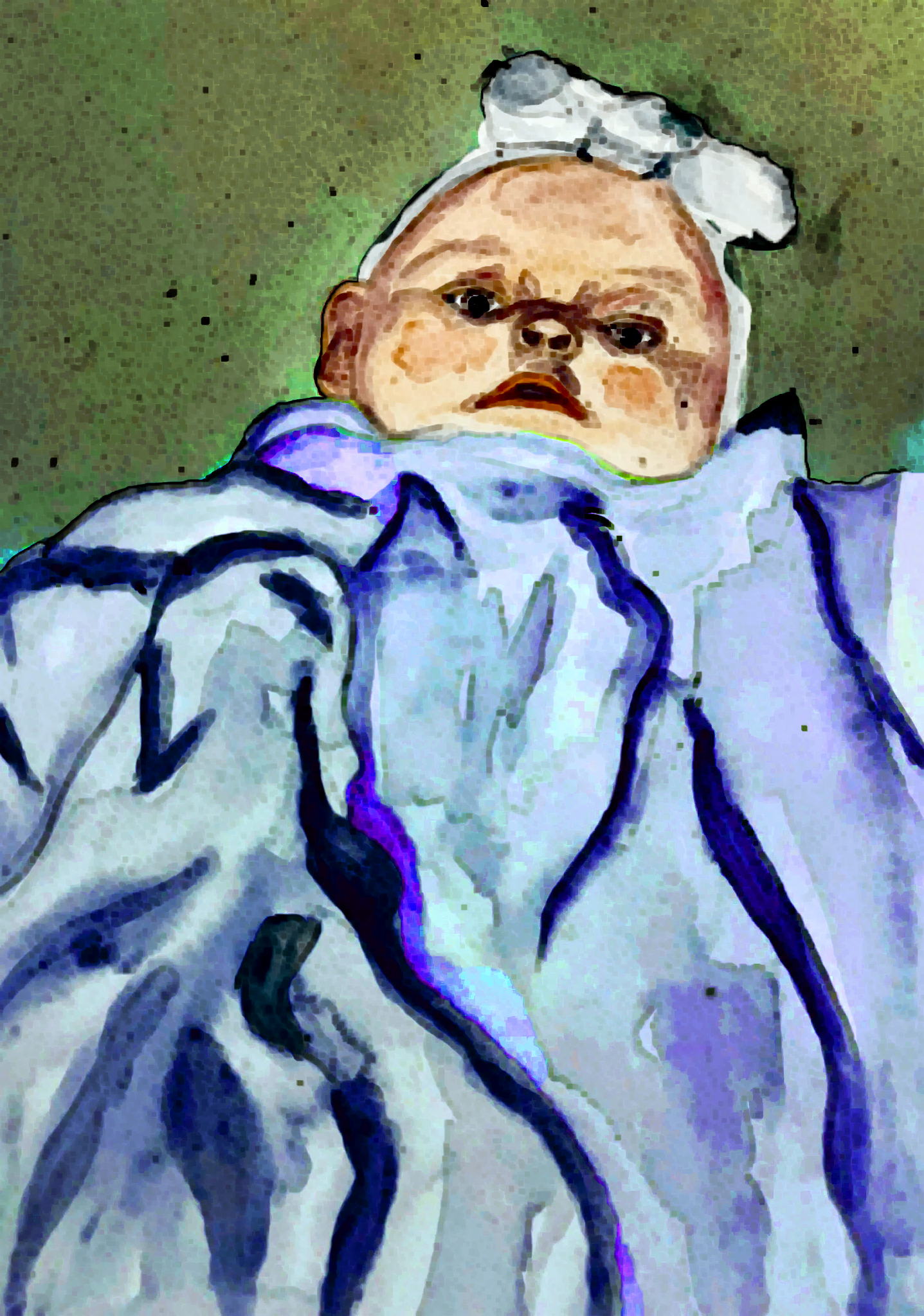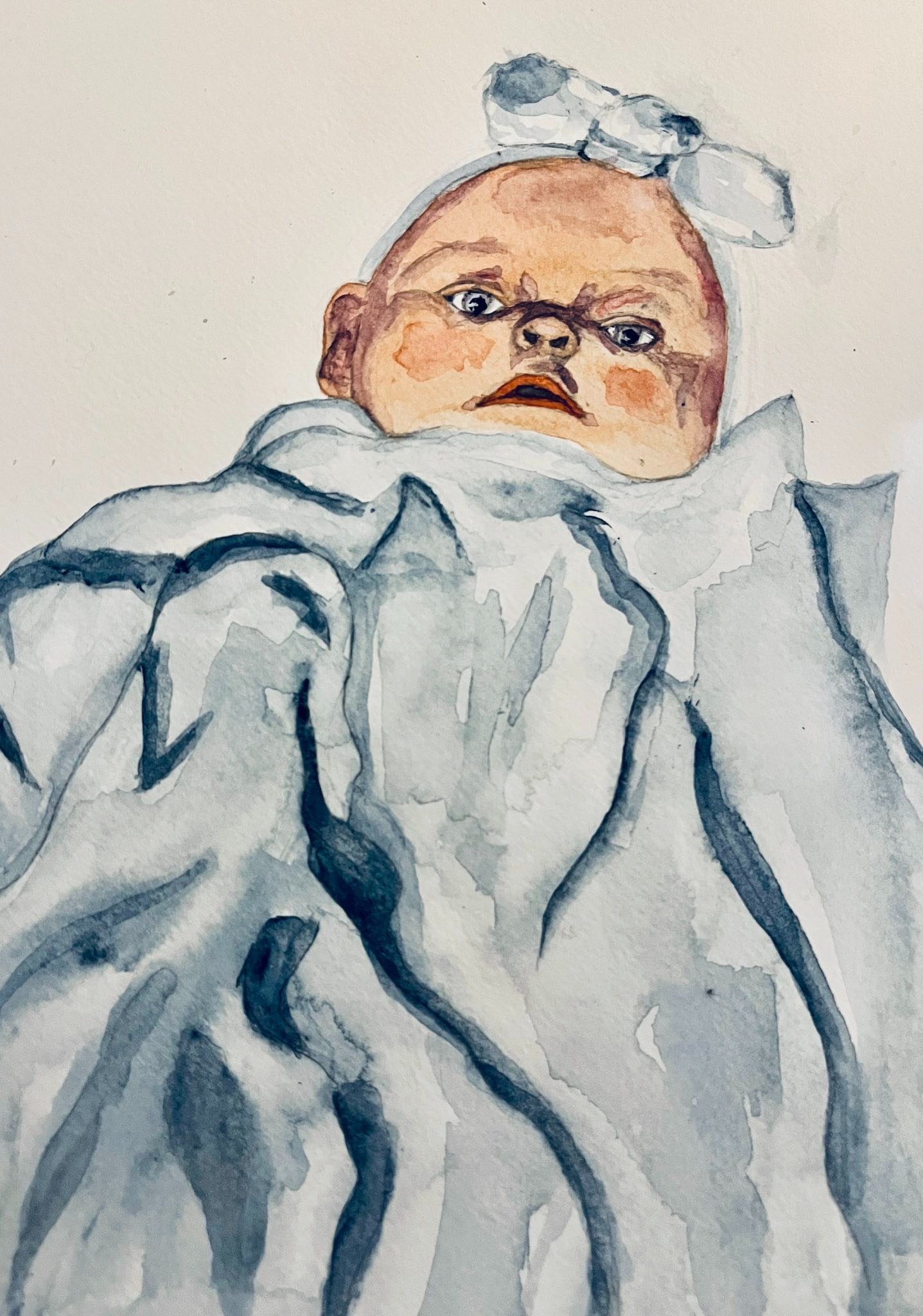 Eingewickelt in ein Hochzeitskleid, das die Eltern mir zur Taufe überzogen, und das seiner Länge nach wie ein Schweif an meinem Babykörper hinabhing, legt man mich auf das nächstgelegene Sofa und macht stolz mehrere Aufnahmen, in denen nur mein Kopf hervorlugt. Dazu die Stirn, ein Schleifchen (=Geschenk) und die verdutzten Augen. Kultur ist kein Korsett, sondern ein Hochzeitskleid für ein Baby. Die Bewegung innerhalb der Zeit sprengt nach und nach die Konturen dieses Kleides und was als Entfremdung, Verwirrung oder Verwandlung verstanden werden kann, hat jeweils seinen eigenen Gebrauchswert für mich. Die Erleichterung, diesen Prozess zu verstehen, wirklich nachzeichnen zu können, nicht nur das Kind in sich zu suchen, ist eine fiktive, wenn auch gefühlte. Wir können es nicht. Ich malte mich, um es zu versuchen.
