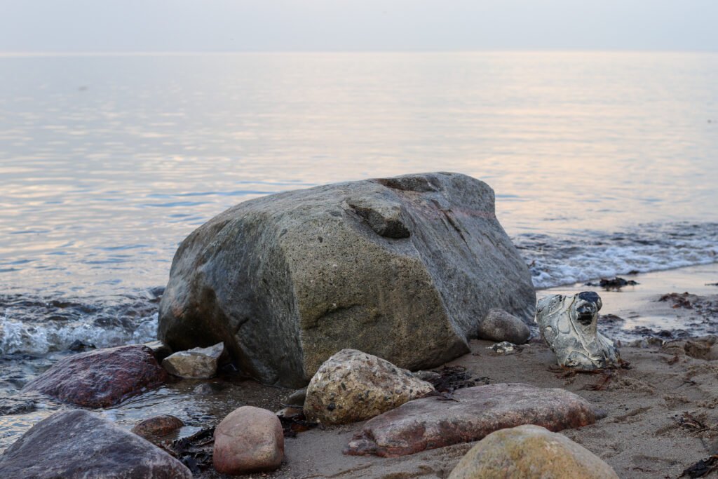 Einmal sah ich große Steine, kleinen ertrunkenen Walkörpern ähnlich, am Meer liegen. Oder sie waren nur die Walbäuche und wölbten sich weich in ihren Formen, seelenruhig und allein. Es gab kein Fleisch aus ihnen auszureißen. Sie atmeten nicht, oder unterdrückten es gut, direkt vor dem leise schwankenden auf dem Boden als Fülle liegenden Wasser. Auch ganz unten, wenn man die Steilküste hinabging, waren welche da. Sie waren zu unbequem zum Sitzen, feucht und hinterließen Dreck auf Jacken.